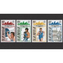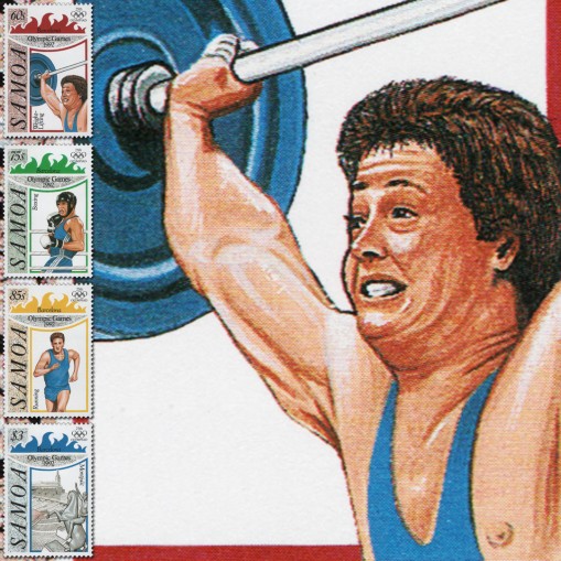 Na znaczkach widnieją kolejno: podnoszenie ciężarów, boks bieg i stadion olimpijski.