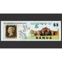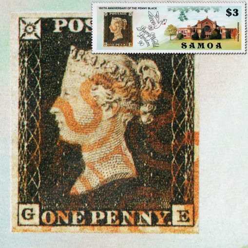 Na znaczku widnieje pierwszy walor brytyjski, tzw. Penny Black, oraz miejsce wystawy - Alexandra Palace w Londynie.