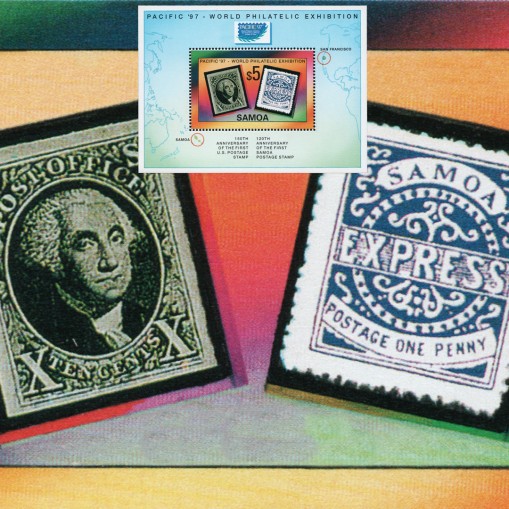 Na znaczku widnieją pierwszy znaczek z Samoa i drugi w historii znaczek amerykański.