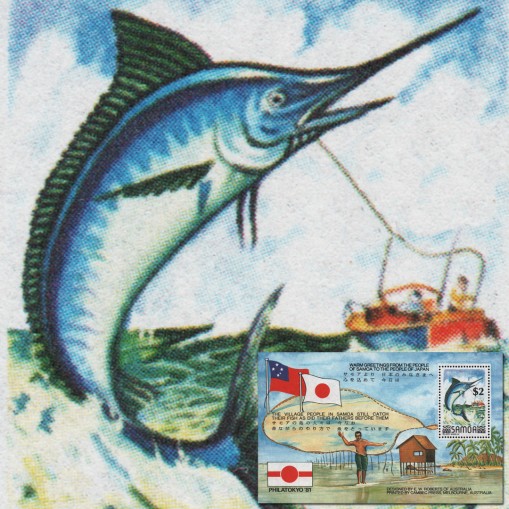 Na bloku przedstawiono tradycyjne metody połowu ryb, a także flagi Japonii i Samoa.