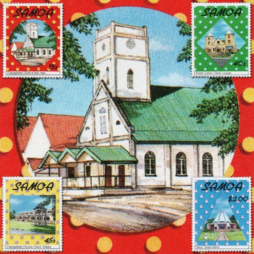 Na znaczkach widnieją świątynie różnych religii na Samoa.
