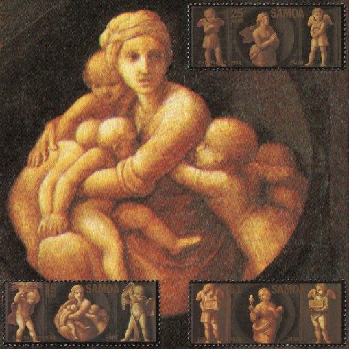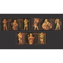 Na znaczkach widnieją malarskie przedstawienia trzech cnót autorstwa Rafaela Santi: Nadziei, Miłości i Wiary.