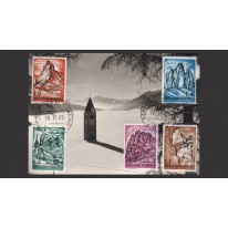 Znaczki na wykonanej prawdopodobnie prywatnie karcie maksimum, na której widnieje jezioro w Val Venosta w Południowym Tyrolu z wieżą kościoła zatopionej tam wioski.
