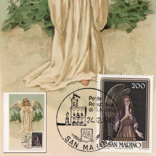 Na znaczku przedstawiono anioła ze srebrnym świecznikiem (obraz rosyjskiego malarza Gregorio Sciltiana), na karcie zaś widnieje reprodukcja kartki pocztowej z początku XX wieku przedstawiającej anioła.