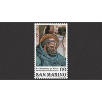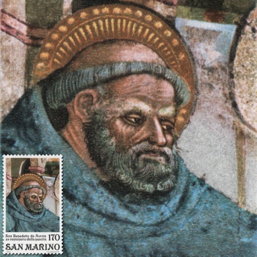 Znaczek upamiętniający 200. rocznicę urodzin świętego Benedykta z Nursji, eremity, mnicha i opata, według tradycji autora reguły benedyktyńskiej.