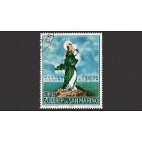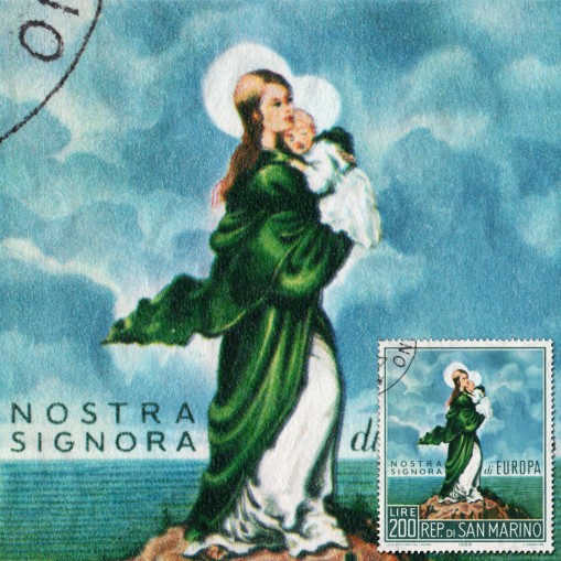 Kasowany znaczek z emisji EUROPA CEPT z 1966 roku, który miał odmienny od innych znaczków tej emisji projekt graficzny - nie żaglowca stworzonego z liter CEPT, ale Maryi Pani Europy (hiszp. Nuestra Señora de Europa albo Virgen de Europa), patronki Gibraltaru stojącej na straży Europy.