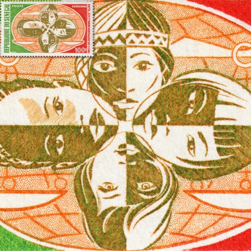 Znaczek upamiętniający 25. rocznicę powstania Organizacji Narodów Zjednoczonych. Widnieją na nim twarze czterech ras ludzkich na tle kuli ziemskiej.