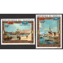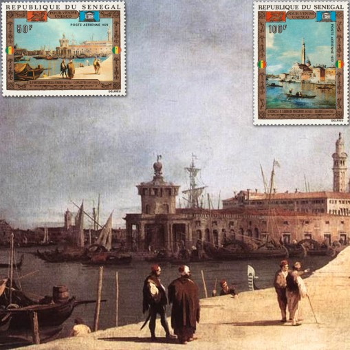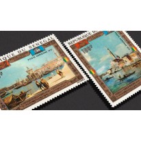 Na znaczkach widnieją fragmenty dzieł malarstwa barokowego przedstawiających Wenecję, kolejno: