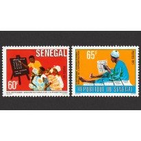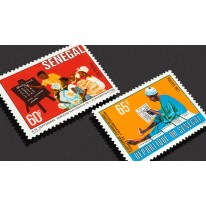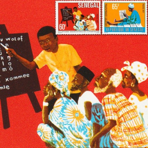 Na znaczkach przedstawiono klasę przed tablicą oraz mężczyznę uczącego się alfabetu.