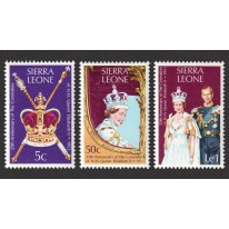 Na znaczkach widnieją kolejno: insygnia królewskie, Elżbieta II w karecie koronacyjnej oraz para królewska.