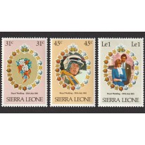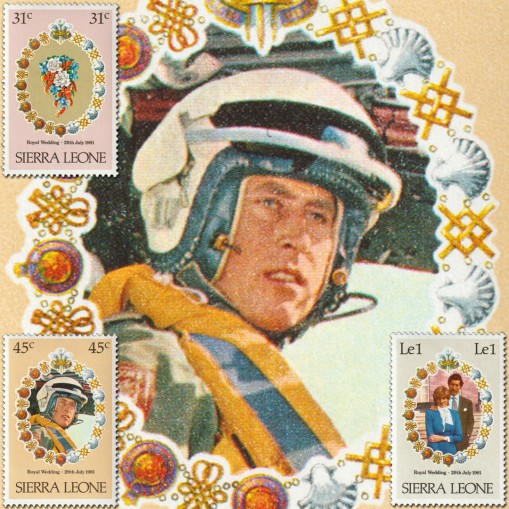 Na znaczkach widnieje bukiet ślubny z Sierra Leone, książę Karol w roli pilota helikoptera oraz nowożeńcy.