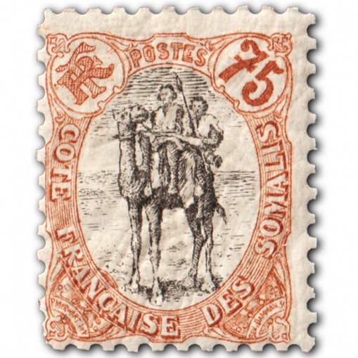 Znaczek przedstawiający Somalijczyków na wielbłądzie pochodzący z serii wydanej w 1903 roku z centralnymi fragmentami znaczków drukowanymi na czarno (w przeciwieństwie do serii wydanej rok wcześniej, gdzie centralne fragmenty znaczków drukowano w kolorze).