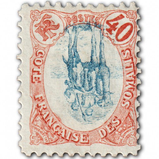 Znaczek przedstawiający Somalijczyków na wielbłądzie pochodzący z serii wydanej w 1902 roku z centralnymi fragmentami znaczków drukowanymi w kolorze (w przeciwieństwie do serii wydanej rok później, gdzie centralne fragmenty znaczków drukowano na czarno).