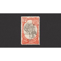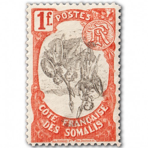 Znaczek przedstawiający somalijskich wojowników pochodzący z serii wydanej w 1903 roku z centralnymi fragmentami znaczków drukowanymi na czarno (w przeciwieństwie do serii wydanej rok wcześniej, gdzie centralne fragmenty znaczków drukowano w kolorze).