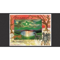 Znaczek w bloku, na którym widnieje lew skradający się do stada zebr.