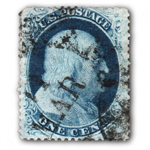 Kasowany znaczek, na którym widnieje Benjamin Franklin, amerykański polityk, drukarz, uczony i filozof, jeden z ojców założycieli Stanów Zjednoczonych.
