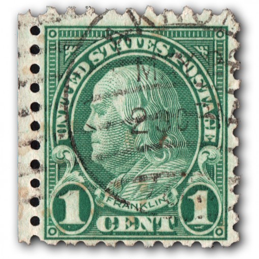 Kasowany znaczek, na którym widnieje Benjamin Franklin, amerykański polityk, drukarz, uczony i filozof, jeden z ojców założycieli Stanów Zjednoczonych.