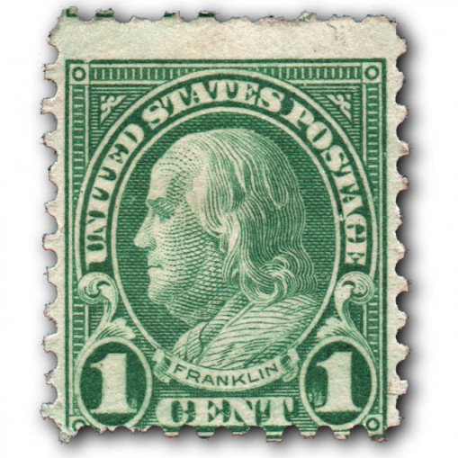 Znaczek, na którym widnieje Benjamin Franklin, amerykański polityk, drukarz, uczony i filozof, jeden z ojców założycieli Stanów Zjednoczonych.