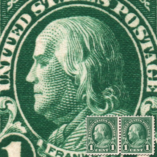 Znaczek w parce, na którym widnieje Benjamin Franklin, amerykański polityk, drukarz, uczony i filozof, jeden z ojców założycieli Stanów Zjednoczonych.