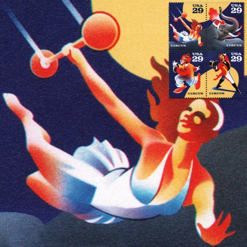 Na znaczkach widnieją kolejno: klaun, dyrektor cyrku, akrobata na trapezie i słoń.