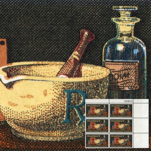 Na znaczku widnieje wyposażenie apteczne: moździerz, buteleczki i symbol farmacji - Kielich Higiei.