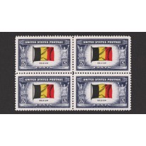 Znaczek w czwórce, na którym widnieje flaga Belgii.