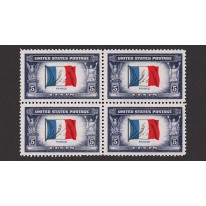 Znaczek w czwórce, na którym widnieje flaga Francji.