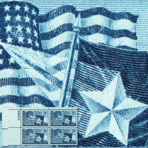 Na znaczku widnieją flagi Stanów Zjednoczonych i Teksasu.