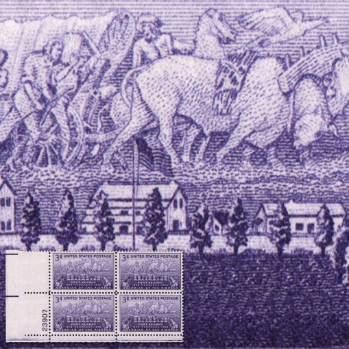 Na znaczku widnieje grupa pionierów przedstawiona na płaskorzeźbie w budynku rządowym stanu Nebraska).