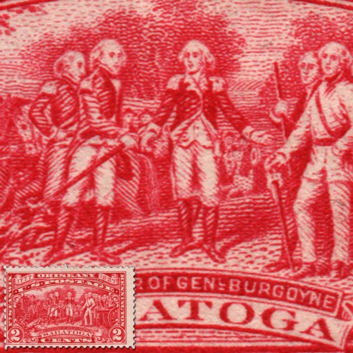 Znaczek upamiętniający 150. rocznicę kapitulacji generała Burgoyne po bitwie pod Saratongą. Bitwa ta miała miejsce podczas wojny o niepodległość Stanów Zjednoczonych i była punktem zwrotnym, gdyż amerykańskie zwycięstwo skłoniło Francję do przystąpienia do wojny po stronie amerykańskiej.