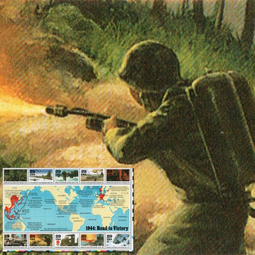 Seria w arkuszu celebrująca udział Stanów Zjednoczonych w II wojnie światowej w 1944 roku.
