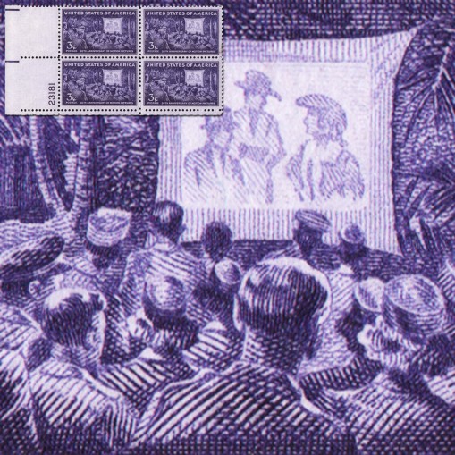 Na znaczku widnieją żołnierze w rejonie południowego Pacyfiku oglądający film na wolnym powietrzu.