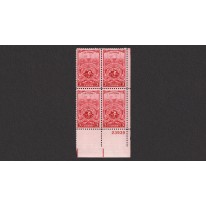 Znaczek w czwórce z marginesem arkusza zawierającym numer kontrolny matrycy [ang. plate block].