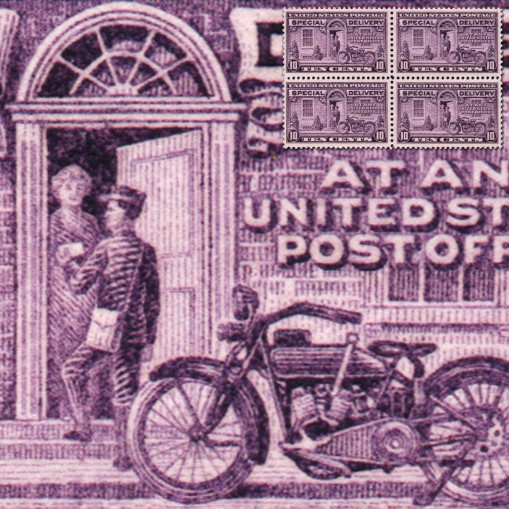Na znaczku widnieje listonosz dostarczający pocztę motocyklem Harley Davidson.
