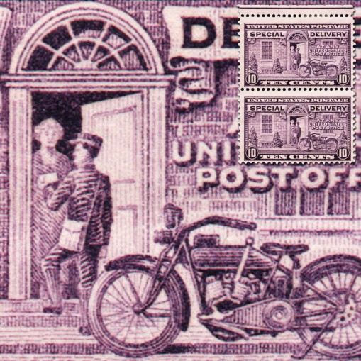Na znaczku widnieje listonosz dostarczający pocztę motocyklem Harley Davidson.
