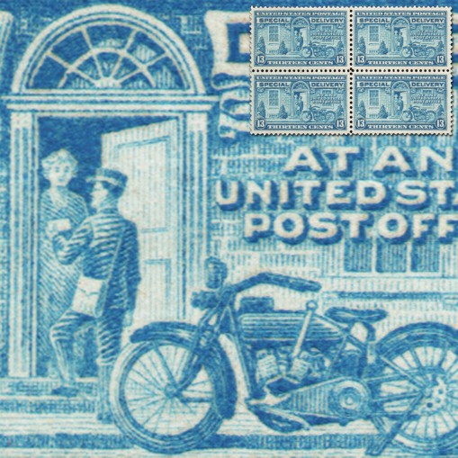 Na znaczku widnieje listonosz dostarczający pocztę motocyklem Harley Davidson.
