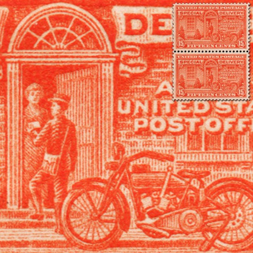 Na znaczku widnieje listonosz dostarczający pocztę motocyklem Harley Davidson.