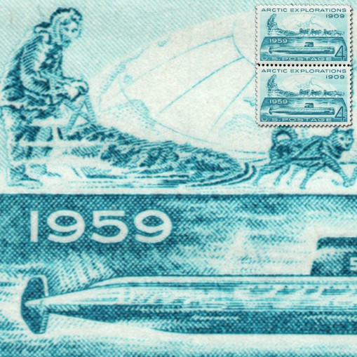 Na znaczku widnieje Robert Peary z psim zaprzęgiem oraz okręt podwodny USS „Nautilus”, pierwsza na świecie jednostka wyposażona w napęd jądrowy.