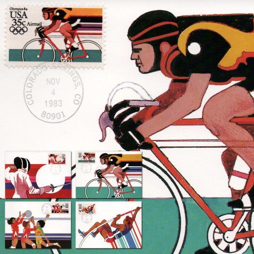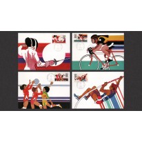 Na znaczkach i kartach widnieją następujące dyscypliny sportu: szermierka, kolarstwo, siatkówka kobiet i skok o tyczce.