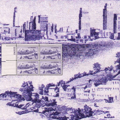 Na znaczku przedstawiono widoki miasta w latach 1850 i 1950.