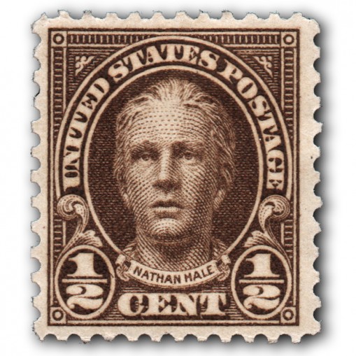 Znaczek, na którym widnieje Nathan Hale, amerykański kapitan w Armii Kontynentalnej podczas Wojny o niepodległość Stanów Zjednoczonych i jeden z oficerów Patriotów, a także bohater narodowy USA i pierwszy szpieg Ameryki.