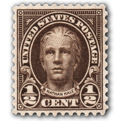 Znaczek, na którym widnieje Nathan Hale, amerykański kapitan w Armii Kontynentalnej podczas Wojny o niepodległość Stanów Zjednoczonych i jeden z oficerów Patriotów, a także bohater narodowy USA i pierwszy szpieg Ameryki.