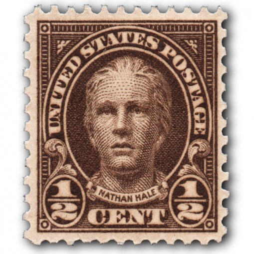 Znaczek, na którym widnieje Nathan Hale, amerykański kapitan w Armii Kontynentalnej podczas Wojny o niepodległość Stanów Zjednoczonych i jeden z oficerów Patriotów, a także bohater narodowy USA i pierwszy szpieg Ameryki.