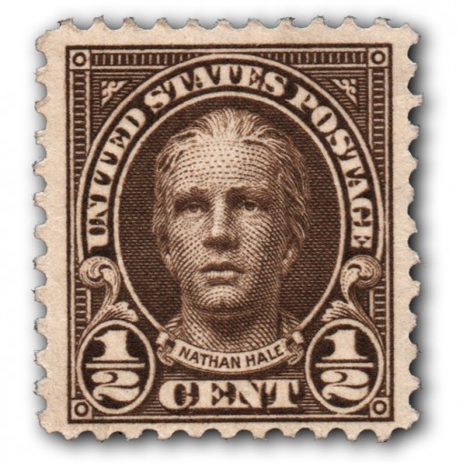 Znaczek, na którym widnieje Nathan Hale, amerykański kapitan w Armii Kontynentalnej podczas Wojny o niepodległość Stanów Zjednoczonych i jeden z oficerów Patriotów, a także bohater narodowy USA i pierwszy szpieg Ameryki.