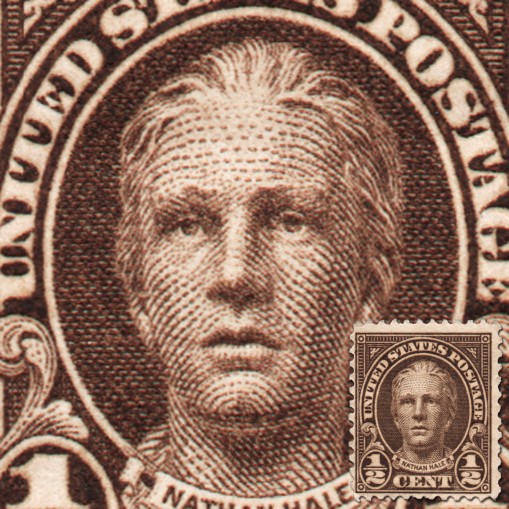 Znaczek, na którym widnieje Nathan Hale, amerykański kapitan w Armii Kontynentalnej podczas Wojny o niepodległość Stanów Zjednoczonych i jeden z oficerów Patriotów, a także bohater narodowy USA i pierwszy szpieg Ameryki.