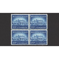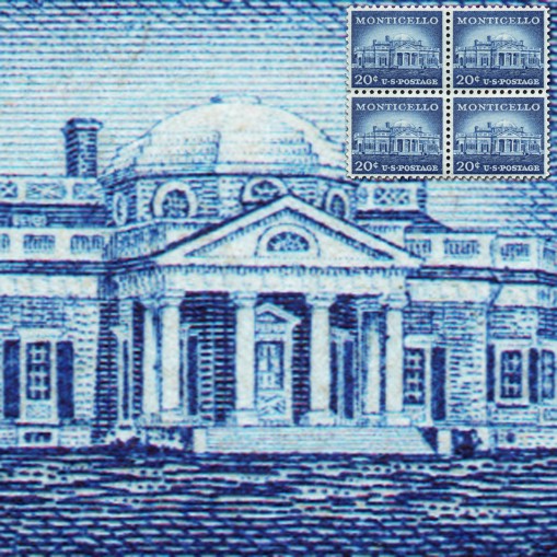 Znaczek w czwórce, na którym widnieje Monticello, posiadłość Thomasa Jeffersona, 3. prezydenta Stanów Zjednoczonych, położona w Charlottesville, w stanie Wirginia.