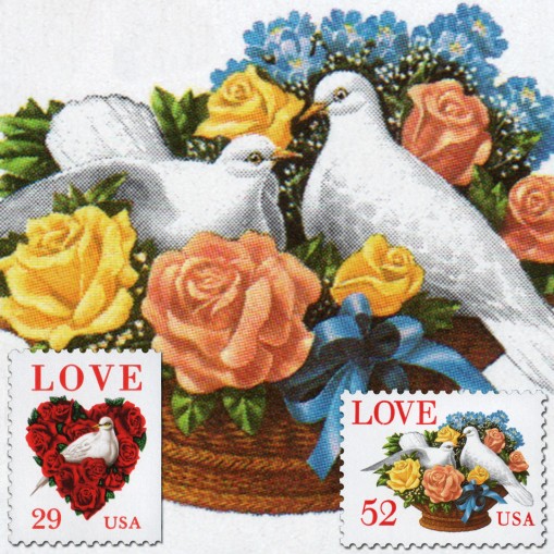 Na znaczkach widnieje bukiet róż w kształcie serca i bukiet różnych kwiatów z gołąbkami.