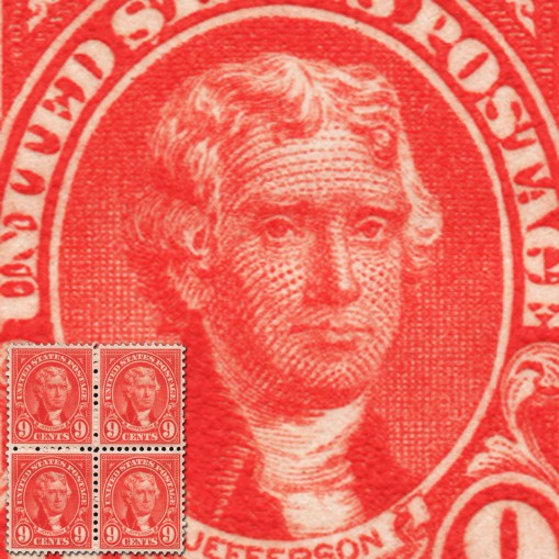 Znaczek w czwórce, na którym widnieje Thomas Jefferson, 3. prezydent Stanów Zjednoczonych.