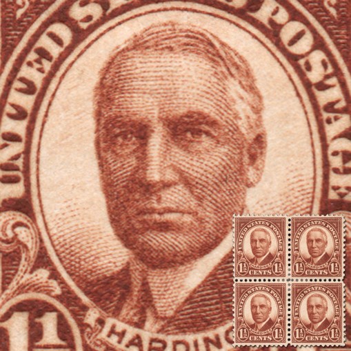 Znaczek w czwórce, na którym widnieje Warren Harding, 29. prezydent Stanów Zjednoczonych.