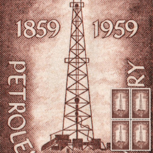 Znaczek w czwórce upamiętniający stulecie amerykańskiego przemysłu naftowego.